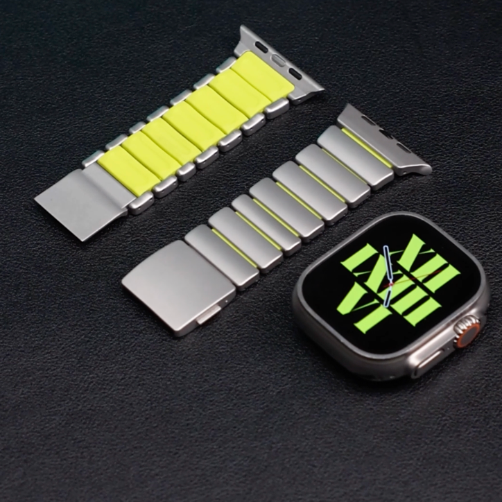 Upgrade your Apple Watch with a modern hybrid bracelet that combines lightweight titanium with flexible silicone connectors for enhanced comfort and durability. Designed to deliver the premium appearance of a metal bracelet while maintaining the flexibility of a sport band, this hybrid construction provides both strength and everyday wearability.